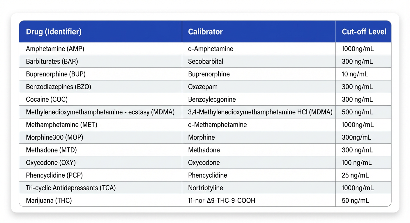 CLIA Waived Rapid 13 panel test cup testing for: AMP, BAR, BUP, BZO, COC, MDMA, MET, MOP, MTD, OXY, PCP, TCA, THC. *Does NOT include ETG & FYL.